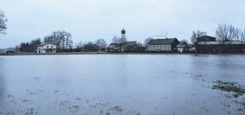 Der Starkregen der vergangenen Tage hat zwar – wie hier im Pfaffinger Ortsteil Ebrach (Foto: Barth) – zahlreiche Felder und Wiesen unter Wasser gesetzt. Von größeren Überschwemmungen ist die Region allerdings verschont geblieben. Auch das Sturmtief Petra, das gestern Nacht über die Landkreise Rosenh