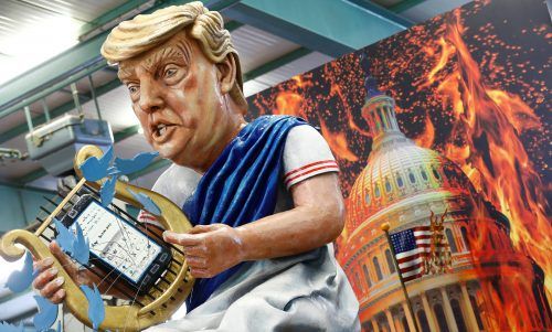 Kaiser Trump Die Frisur und der zornige Blick sind gut getroffen, und auch sonst hat der Mainzer Carneval-Verein von 1838 viel Liebe zum Detail bewiesen. In der Rolle als Kaiser Nero setzt Donald Trump auf diesem Rosenmontagswagen allerdings nicht Rom in Brand, sondern das Kapitol in Washington. fot