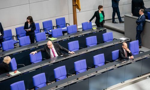 Abstand halten! Es war eine Sitzung der anderen Art: Der Bundestag hat gestern die Hilfspakete in der Coronakrise verabschiedet. Die Minister Lamprecht, Altmaier, Kramp-Karrenbauer, Scholz und Maas achteten dabei auf den nötigen Abstand. Geheime Tuscheleien waren an diesem Tag eher selten. Foto: Mi