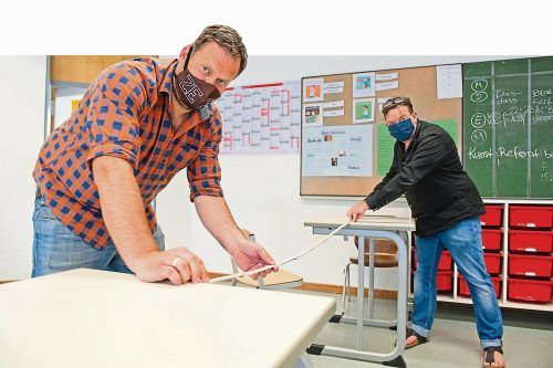 Abstand halten auf der SchulbankJochen Fuchs (r.), Rektor der Mittelschule Puchheim, und Lehrer Martin Wagner nehmen an den Schultischen Maß. Eineinhalb Meter Abstand lautet die Regel, wenn am Montag die Schulen für die Abschlussklassen öffnen. Es gibt aber noch mehr zu beachten. Foto: Tobias Gehre