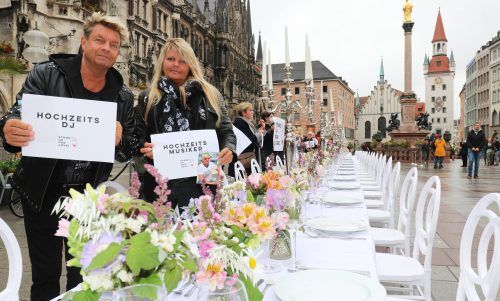 Hochzeits-FlauteDutzende Dienstleister aus der Hochzeitsbranche haben in München auf ihre schwierige Situation in Corona-Zeiten aufmerksam gemacht. Sie bauten eine meterlange Hochzeitstafel vor dem Rathaus auf dem Marienplatz auf und stellten ihre Aktion unter das Motto „Stand up for Love!“ foto: Ma