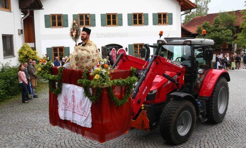 Segen aus dem FrontladerWeil wegen der Corona-Krise die Fronleichnamsprozessionen in ihrer gewohnten Form ausgefallen sind, behalfen sich die Gläubigen in Oberbayern mit Einfallsreichtum. Wie in Böbing im Landkreis Weilheim-Schongau, wo Pfarrer Josef Fegg mit der Monstranz im farblich passend geschm