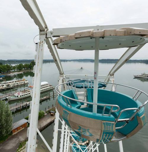 Ab heutigen Donnerstag können Chiemsee-Besucher für mindestens vier Wochen das Bayerische Meer aus einer neuen Perspektive erleben – und zwar von oben. Ein fast 40 Meter hohes Riesenrad lädt am Priener Hafen zur fünfminütigen Fahrt ein. Bis zu 150 Fahrgäste fasst das Riesenrad mit seinen 26 Gondeln.