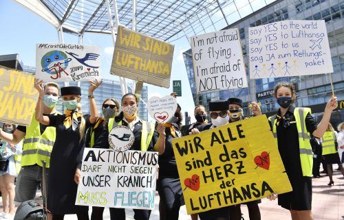 Mit Herzblutwerben Lufthansa-Beschäftigte für die Annahme des staatlichen Rettungspakets, über das heute entschieden wird. Fast 1000 Lufthanseaten demonstrierten dafür gestern in München. Am Abend wurde bekannt, dass Großaktionär Heinz Hermann Thiele die Rettung nicht torpedieren wird. Foto: Marcus