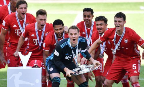 Deutscher Geister-MeisterNoch in der Hinrunde stand der FC Bayern zeitweise auf Platz sieben. Am Ende wurde es doch eine Meisterschaft der Superlative. Das Team hat 100 Tore geschossen und eine Rekord-Rückrunde gespielt. Am Samstag durfte Kapitän Manuel Neuer die Schale in die Höhe recken. Foto: Si