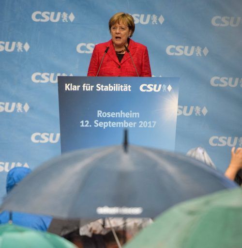 Ob sich das Wetter freundlicher zeigt, als bei ihrem Besuch im September 2017 (Foto: dpa) in Rosenheim? Am kommenden Dienstag, 14. Juli, wird Bundeskanzlerin Angela Merkel (CDU) auf Einladung des bayerischen Ministerpräsidenten Markus Söder (CSU) zur Sitzung des bayerischen Kabinetts auf Herrenchiem