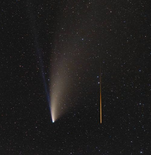 Noch bis Mittwoch hat man bei dunklem Himmel die Chance, Komet Neowise am Firmament zu sehen. Frei per Auge wird es schwierig, mit Fernglas und Teleskop könnte es im Verbreitungsgebiet der OVB-Heimatzeitungen noch klappen. Dem Aiblinger Markus Bauer gelang jetzt ein besonderer Schnappschuss des Kome