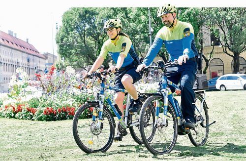 Uniform für Radl-PolizeiDie 500 Fahrrad-Polizisten in Bayern bekommen erstmals eigene Uniformen: Zip-Hosen, Trikots und neue Helme sollen den Einsatz erleichtern. Das Design ist an die Motorradstreifen angelehnt. Unser Bild zeigt die Polizisten Martin Jürgens und Jenny Babe in München. Foto: Marcus