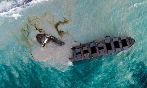 Umwelt-Desaster Die Regierung spricht vom schlimmsten ökologischen Desaster, das das Urlaubsparadies je erlebt hat. Der vor Mauritius havarierte Frachter „Wakashio“ ist auseinandergebrochen. Das 300 Meter lange japanische Schiff war vor rund drei Wochen auf einem Korallenriff auf Grund gelaufen. af
