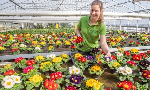 Willkommen im Primelmeer Nur ein paar Tage noch warten, dann dürfen Bayerns Gärtnereien wieder öffnen. In der Miesbacher Gärtnerei Dirscherl bereitet Mitarbeiterin Sofie Mayr schon mal alles vor. Auch Friseure haben zum Stichtag 1. März wieder geöffnet. Foto: THOMAS PLETTENBERG