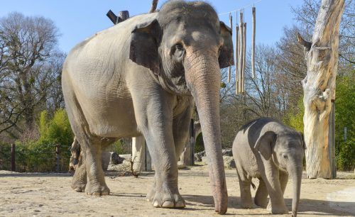 Der Hellabrunner Elefantenbulle Otto entwickelt sich prächtig. Begleitet von Mutter Temi wagte sich der schon fast vier Monate alte Treibauf jetzt zum ersten Mal auf die Außenanlage. Inzwischen bringt Otto 240 Kilogramm auf die Waage und hält Temi ordentlich auf Trab. Tierpark-Direktor Rasem Baban h