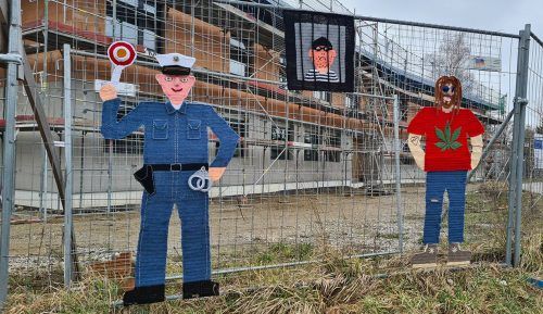 Sie hat wieder „zugeschlagen“, die unbekannte Häkelkünstlerin aus Wasserburg. „Tatort“ ist diesmal die Baustelle der neuen Polizeiinspektion (PI) in der Burgau. Hier begrüßt ein Kollege aus Wolle die Passanten. Hinter dem Gitter des Bauzauns: ein Ganove, davor ein Kiffer. „Schaut toll aus“, sagt Was