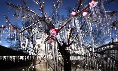 Der Frühling taut aufNoch schützt ein dicker Eispanzer die Aprikosen- und Pfirsichblüten in Escherndorf in Unterfranken vor dem Erfrieren. Doch jetzt können sich die Bienen langsam startklar machen: Es wird wieder wärmer, am Wochenende wird’s sonnig bei bis zu 17 Grad. Foto: Karl-Josef Hildenbrand/d