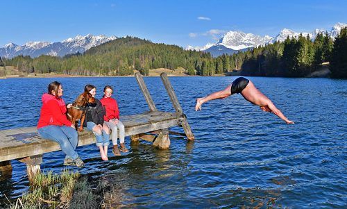 Kühner Sprung im eisigen AprilEin Sprung in den Geroldsee bei Krün (Kreis GAP) bei gefühlt 12 Grad – das tut weh, gestand Thomas Haugeneder nach dem Auftauchen. Aber die Schönheit der Natur lockte, und die Familie passte auf. Trotz Sonne: Dieser April ist der kälteste seit 40 Jahren. Kornatz
