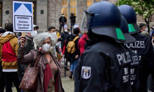 Nahost-Konflikt ganz nah Der gewaltsame Konflikt im Nahen Osten zwischen Israel und den Palästinensern erhitzt auch in Deutschland die Gemüter. Unser Foto zeigt eine pro-palästinensische Demonstration im Berliner Stadtteil Neukölln, die von Polizeibeamten überwacht wird. In mehreren Städten kam es z