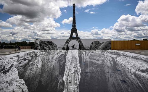 Straßenkunst mit Turm Wenn das keine optische Täuschung ist! Der französische Street-Art-Künstler und Fotograf Jean Rene, kurz JR, hat vor dem Eiffelturm ein ganz besonderes Kunstwerk geschaffen. Wer den richtigen Blickwinkel hat, entdeckt unter dem Pariser Wahrzeichen plötzlich Straßenschluchten. F