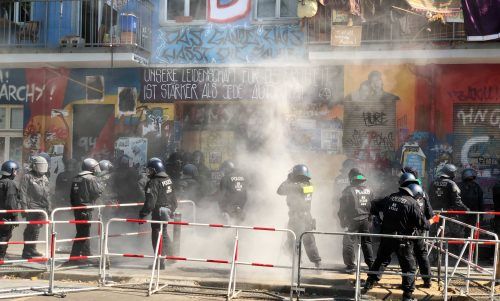 Häuserkampf in BerlinZur Durchsetzung einer Brandschutzprüfung im besetzten Gebäude „Rigaer 94“ in Berlin-Friedrichshain hat sich die Polizei Zutritt zu dem Haus verschafft. Bewohner attackierten die Beamten mit Pulver aus Feuerlöschern und bewarfen sie mit Farbe und Feuerwerkskörpern. dpa