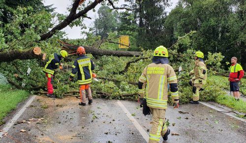 Erneute UnwetterwalzeEin Unwetter mit Hagel, Starkregen und Sturmböen hat in den Landkreisen Rosenheim und Traunstein am gestrigen Mittwoch erneut für massive Schäden gesorgt. So musste die Feuerwehr in Halfing nicht nur Straßen von umgefallenen Bäumen befreien (Foto: Ammelburger). Auch den Kirchtur