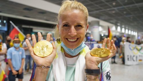 Goldiger Empfang Die zweifache Olympiasiegerin Jessica von Bredow-Werndl aus Aubenhausen bei Tuntenhausen ist zurück in ihrer Heimat. Bereits am Frankfurter Flughafen wurde die 35-Jährige (Foto: dpa) von vielen Fans empfangen. Die Jubelstürme bei der Ankunft am Münchner Flughafen, wo Familie und Fre