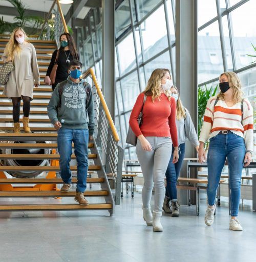 Auch wenn das Tragen der Maske aufgrund Corona wohl noch länger Pflicht bleibt – viele Studenten der Technischen Hochschule Rosenheim (Foto: Max Baudrexl) sind froh, ihrem Studium endlich wieder in den Hörsälen nachgehen zu können. Die Technische Hochschule, am 1. August 1971 aus dem Holztechnikum a