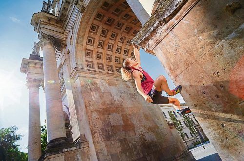 Klettertour aufs Siegestor?Mit dieser Fotomontage werben die Veranstalter der European Championships für die Europameisterschaften in neun Sparten, die im August 2022 in München ausgetragen werden. Im Programm ist auch Sportklettern – auf das Siegestor wird jedoch nicht gekraxelt.