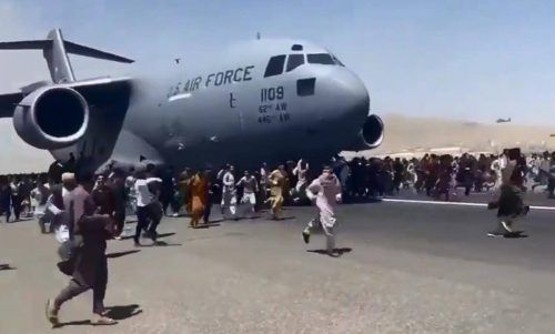 Chaos in Kabul Nach dem Fall der afghanischen Hauptstadt an die Taliban spielen sich am Flughafen dramatische Szenen ab. Tausende versuchen, irgendwie auf Evakuierungsflüge aufzuspringen. An diesen US-Flieger klammerten sich Menschen, einige fielen später offenbar in die Tiefe.