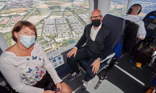 Hoch über der IAAVom Zeppelin aus verschafften sich gestern der Münchner Messechef Klaus Dittrich und Hildegard Müller, Präsidentin des Verbandes der Automobilindustrie, einen Überblick über das Ausstellungsgelände in München-Riem, auf dem heute die Mobilitätsmesse IAA beginnt.