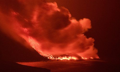 Das Meer kocht Am elften Tag des Vulkanausbruchs auf La Palma war es soweit: Der glühend heiße Lavastrom erreichte die Westküste der kleinen Kanareninsel und stürzt seither über eine gut 100 Meter hohe Steilküste in den Atlantik. Behörden warnten vor gefährlichen Dämpfen. Saul Santos/AP/dpa