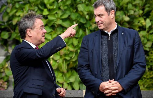 Stürmische Begegnung Es ging mitunter stürmisch zu zwischen diesen beiden Herren in den vergangenen Monaten. Nun haben sich Armin Laschet und Markus Söder mal wieder getroffen. Zum Start der Ministerpräsidentenkonferenz in Königswinter traten sie vor die Kameras. foto: epa