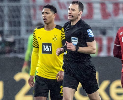 So groß war der Ärger bei Borussia Dortmund über Entscheidungen von Schiedsrichter Felix Zwayer (r.) bei der 2:3-Niederlage gegen den FC Bayern, dass Jungstar Jude Bellingham (l.) an die Vorgeschichte des einst in einen Manipulationsskandal verstrickten Referee erinnerte. Der DFB-Kontrollausschuss w
