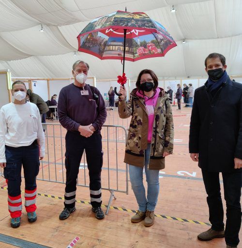 Einen Schutz gegen das Coronavirus und gegen mieses Wetter hat jetzt Christina Spohner aus Bruckmühl bekommen. Ihre Booster-Impfung war die 250000ste Dosis, die im Impfzentrum von Stadt und Landkreis Rosenheim auf der Loretowiese verabreicht worden ist. Für den Jubiläumsimpfling hatten (von links, F