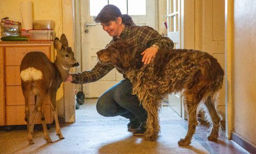 Ziemlich beste Freunde Rehkitz Hansi ist nicht von der ängstlichen Sorte. Vergangenes Jahr ist es spontan bei Katja Hitzelsperger und deren Familie eingezogen. Seitdem fühlt es sich in dem Haus im Kreis Ebersberg fast so wohl wie im Wald. Haushündin Distel und Hansi sind unzertrennlich. Foto: Dziem