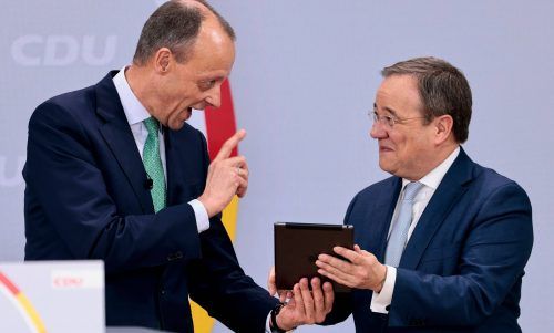 Friedrich Merz und sein FingerzeigMit weit über 94 Prozent ist Friedrich Merz zum CDU-Vorsitzenden gewählt worden. Der glücklose Armin Laschet übergab den Posten und bemühte sich vor den digital zugeschalteten Delegierten um eine fröhliche Miene. Foto: Pappeler/dpa