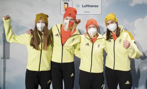 Angriffslustig nach Peking Gestern flogen die ersten 40 deutschen Olympiateilnehmer von Frankfurt/Main zu den Winterspielen nach China (4. bis 20. Februar). Auf unserem Foto sind die Skispringerinnen zu sehen. Von links: Juliane Seyfahrt, Pauline Heßler, Katharina Althaus und Selina Freitag. Foto: d