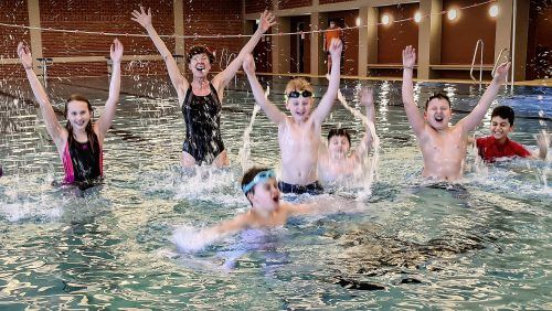 „Pack die Badehose ein“, heißt es im neuen Haager Schwimmbad. Der Schwimmverein Haager Hechte und Bürgermeisterin Sissi Schätz (Zweite von links) haben das Sportbecken bereits ausprobiert. Für sieben bis acht Millionen Euro hat der Schulverband mit den angeschlossenen Gemeinden Haag, Kirchdorf, Rech