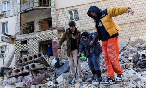 Das Leid der Alten Viele Junge haben angesichts des Krieges in der Ukraine das Land verlassen, gerade Ältere sind oft alleine gelassen. Diese Frau hat ein wenig Glück im allgegenwärtigen Unglück: Zwei Männer helfen ihr über die Trümmer eines zerstörten Wohngebäudes in der ukrainischen Hauptstadt Kie