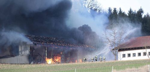 In Reischach im Landkreis Altötting hat der Brand einer Landmaschinenhalle (Foto: Eß) einen geschätzten Schaden von 400 000 Euro angerichtet. Weder das Gebäude noch die darin abgestellten Maschinen konnten bei dem Feuer am Montagnachmittag gerettet werden. Ein Großaufgebot von Feuerwehren verhindert