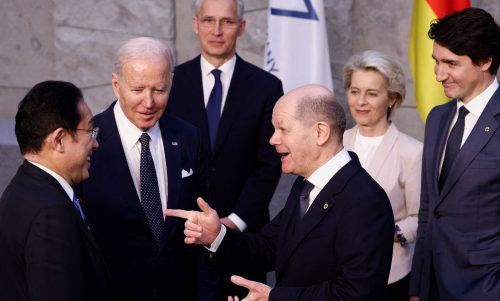 Ein wenig Spaß in sehr ernsten Zeiten. Olaf Scholz scherzt mit dem japanischen Premier Fumio Kishida und US-Präsident Joe Biden. In Brüssel jagte gestern angesichts des Ukraine-Kriegs ein Gipfel den nächsten: Nato, G7 und EU sprachen über Sicherheit, Sanktionen und neue Energieversorgung. Foto: NI