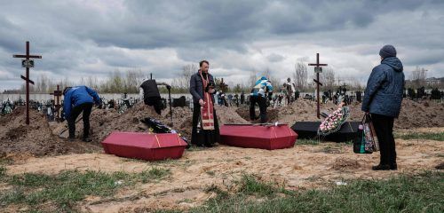 Beerdigung in Butscha Es sind erschütternde Bilder: In Butscha beerdigen die Überlebenden ihre Angehörigen. Nadia (re.) trauert um ihren Mann. Pfarrer Andrii Holovine versucht, der Zeremonie einen würdigen Rahmen zu geben. Unfassbar: Russlands Präsident Wladimir Putin hat die Brigade, der die Ukrain