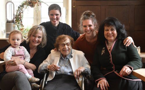Fünf Generationen Anni Braband (Mitte) wird bald 101 Jahre alt. Sie ist Sendlingerin durch und durch – genau wie Tochter Inge Fuentes-Martinez (re.), Enkelin Andrea Flechtenmacher (2. v. li.), die Ur-Enkelinnen Cristina Schachtlbauer und Yvonne Katte (hi.) sowie Ur-Ur-Enkelin Luisa. Foto