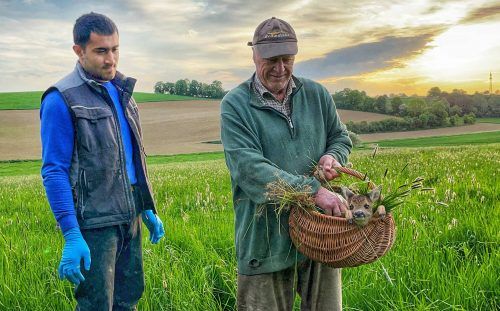 Ein Kitz im Korb hält Landwirt Hans Holzner aus Großenviecht (Kreis Freising) – und ist erleichtert: Sein Mitarbeiter Aykhan Ismayilov und er haben es gerade mithilfe einer Wärmebild-Kameradrohne vom Freisinger Jägerverein in der Wiese aufspüren lassen und somit vor dem sicheren Tod bei der nahenden