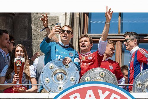 Meisterfeier Der FC Bayern hat nach der Corona-Zwangspause wieder mit seinen Fans auf dem Münchner Marienplatz gefeiert. Münchens Oberbürgermeister Dieter Reiter (SPD) empfing Neuer, Müller & Co. nach der zehnten Meisterschaft in Serie am Sonntag im Rathaus. Tausende jubelte ihnen zu.