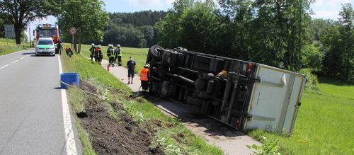 Spektakulärer Unfall am gestrigen Montagmittag zwischen Bad Endorf und Rimsting: Ein 46-jähriger Lkw-Fahrer aus Traunreut hatte gegen 13 Uhr in einer Kurve am Kalkgruber Berg die Kontrolle über sein Fahrzeug verloren. Der Lkw kam daraufhin von der Fahrbahn ab und kippte auf die Seite. Der Lkw-Fahrer