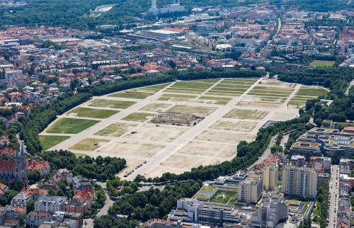 Ein Blick auf die Theresienwiese in München: Ein einziges Zelt – die Bräurosl – wird schon aufgebaut, das Gerippe steht. Tatsächlich begann am Montag mitten in einer Hitzewelle die heiße Phase der Vorbereitungen für die Wiesn. Drei Monate vor dem Anstich rollen auf dem Festgelände Gabelstapler und L