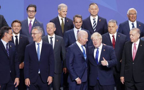 Der nächste Riesen-GipfelElmau ist überstanden, nun läuft ein Gipfel in Madrid. Die Staats- und Regierungschefs der Nato vereinbaren, wie sie auf Russlands Angriffskrieg gegen die Ukraine reagieren. Im Mittelpunkt: Joe Biden, der die Hand auf Boris Johnson legt. foto: epa