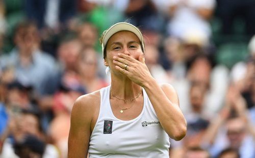 Sie kann es nicht fassen! Zweifach-Mama Tatjana Maria (Foto: afp/Bozon) steht mit 34 Jahren im Wimbledon-Viertelfinale. Dort kommt es zum deutschen Generationen-Duell mit Senkrechtstarterin Jule Niemeier (22).