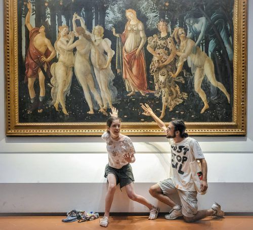 Zwei Klimaschutzaktivisten haben sich in den Uffizien in der italienischen Stadt Florenz mit ihren Handflächen an Sandro Botticellis Gemälde „Primavera“ festgeklebt – genauer gesagt an die Panzerglasscheibe, die das Meisterwerk vor Übergriffen schützt. Gemeinsam mit einer dritten Aktivistin entrollt