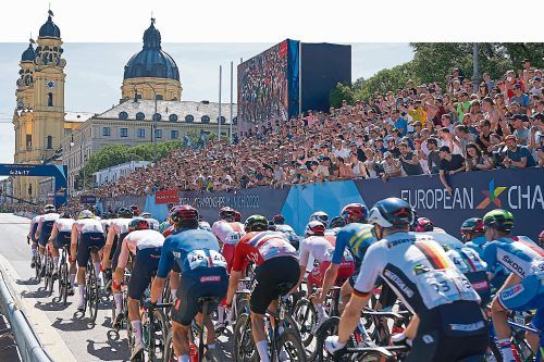 Einzigartiges SportfestDie European Championships in München haben am Wochenende Zehntausende in ihren Bann gezogen. Am Sonntag reichte die Sportbegeisterung sogar bis ins Oberland: Das EM-Straßenradrennen startete in Murnau – und endete am Odeonsplatz. Foto: Hartmann