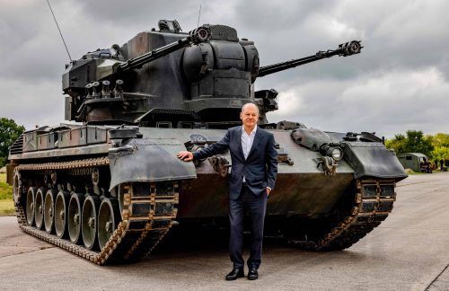 Der Kanzler am PanzerDunkle Wolken über einem Kanzler am Gepard-Flugabwehrkanonenpanzer: Olaf Scholz (SPD) hat auf dem Truppenübungsplatz Putlos an der Ostsee die Ausbildung ukrainischer Soldaten besucht. Er bekräftigte die deutsche Waffenhilfe für die Ukraine. FOTO: AXEL HEIMKEN/AFP