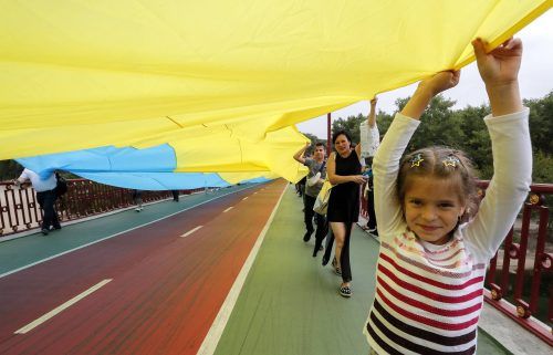 430 Meter FlaggeEin Zeichen von Stolz und Kampfgeist mitten in Kiew: Die Bürger der Stadt haben eine 430 Meter lange Riesenfahne über eine Brücke getragen. Am Ende verband der Stoff in den Nationalfarben Gelb und Blau am Sonntag beide Seiten des Flusses Dnipro. Foto: Sergey DolZHENKO/EPA
